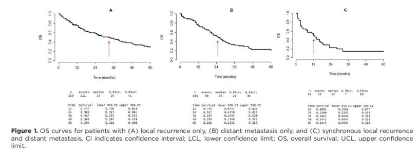 RESULTS: In an initial series of 1007 patients with primary RPS, 408 patients developed recurrent disease during the follow-up period. The median follow-up from the time of recurrence was 41 months. The median OS was 33 months after LR (n5219), 25 months after DM (n5146), and 12 months after LR1DM (n543), and the 5-year OS rates were 29%, 20%, and 14%, respectively. Predictors of OS after LR were the time interval to LR and resection of LR, while histologic grade approached significance. For DM, significant predictors of OS were the time interval to DM and histologic subtype. The subgroup of patients who underwent resection of recurrent disease had a longer median OS than patients who did not undergo resection.