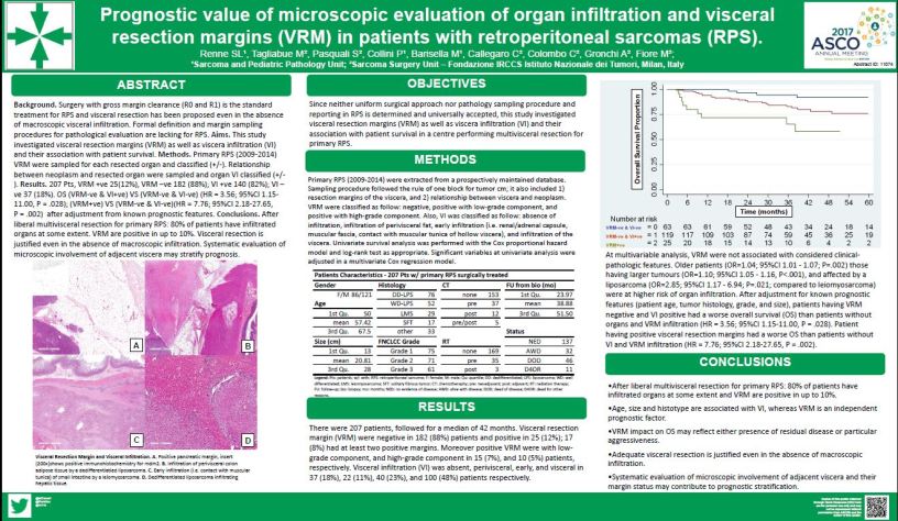 INT Sarcoma Group in Milan recently presented at ASCO2017 preliminary data on evaluation of prognostic role of resection margins in RPS. Both margins on resected organs and infiltration of perivisceral tissues were analyzed. Results are interesting. Click here to download ASCO poster.